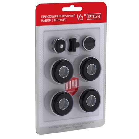 Royal Thermo (Роял Термо) Набор присоединительный 1/2 black представляет собой специальный комплект для подсоединения к отопительной системе биметаллического или алюминиевого секционного радиатора компании Royal Thermo. В данный набор входят четыре гайки с силиконовыми прокладками, заглушка, воздухоотводчик и ключ для воздухоотводчика.