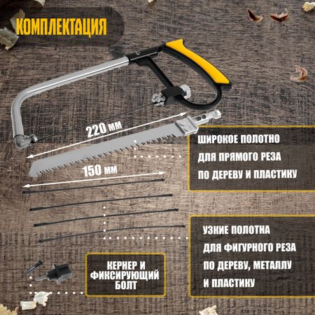 Набор с ножовкой ТУНДРА, пилки по металлу 5 шт., пилка универсальная 1 шт.. Набор с ножовкой ТУНДРА — это комплект инструментов, предназначенный для различных видов пиления и работы с металлом. Он включает в себя ножовку, универсальную пилку и 5 пилок по металлу. Ножовка изготовлена из прочного металла, который обеспечивает долговечность и надежность инструмента. Двухкомпонентная ручка инструмента удобно лежит в руке и обеспечивает комфортную работу. Лезвие имеет специальную заточку, позволяющую легко и точно резать различные материалы, включая дерево, пластик и металл. Пилки по металлу имеют различную зубчатость, что позволяет выбрать подходящую пилку в зависимости от толщины и жесткости материала.