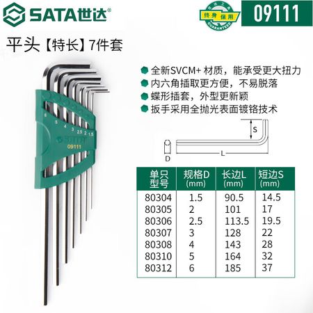 Набор специальных длинных шестигранных ключей SATA с плоской головкой SVCM, легированная сталь, закаленная метрическая система, набор из 7 предметов 09111