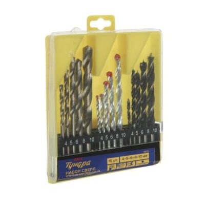 Набор сверл комбинированный ТУНДРА, цилиндрический хвостовик, 4-5-6-8-10 мм, 15 шт.. Сверло по металлу представляет собой инструмент винтовой формы с заостренным концом. Такая оснастка без труда входит даже в самые твердые материалы и создает максимально точные отверстия. Данная модель предназначена для работы: <ul> <li> c деревом;</li> <li> c металлом;</li> <li> c бетоном.</li> </ul>