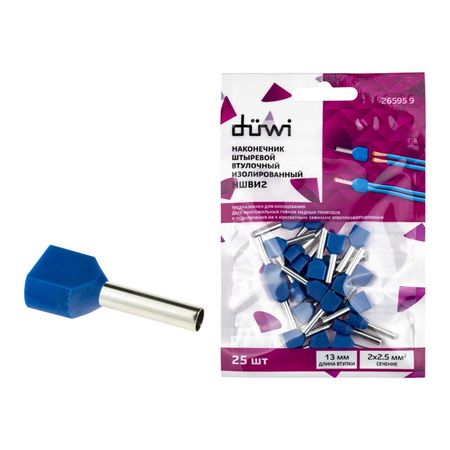 Главная » Строительство и ремонт наконечник-гильза двойная с изолированным фланцем DUWI НШВИ2 2х2,5 кв. мм под опрессовку синие 25шт Просмотров 8 Макс.сечение жилы: 2,5кв.мм Материал: медь Количество в упаковке: 25 Цвет: синий DUWI