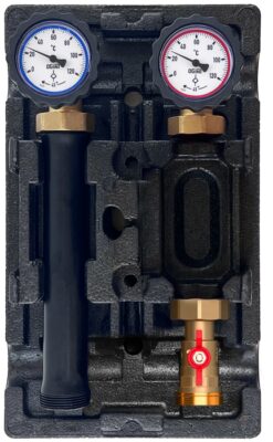 Со стороны системы теплопотребления все насосные группы снабжены запорными шаровыми кранами, совмещенными со стрелочными термометрами.