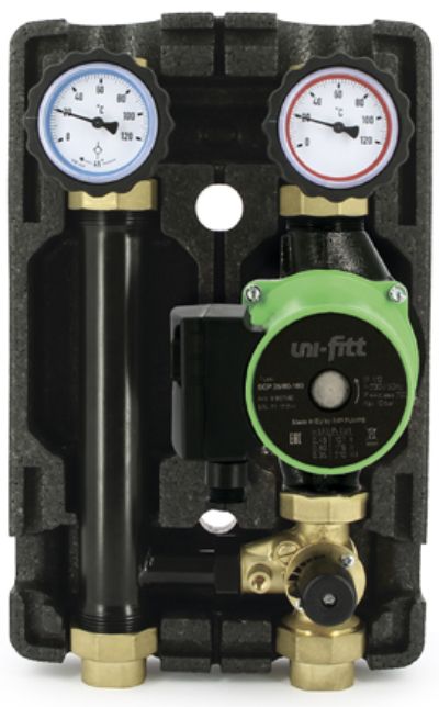 Насосно-смесительная группа Uni-Fitt (Уни-Фит) DN25, с 3-х ход. клапаном, Uni-Fitt SCP 25/60 180 предназначена для поддержания стабильной и равномерной температуры подачи теплоносителя в водогрейных и отопительных системах. Арматура выполнена из коррозионностойкой латуни и оснащена высокоэффективной теплоизоляцией. Возможна установка группы как на распределительном коллекторе, так и отдельно.