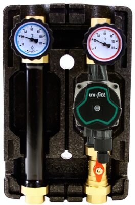 Для подачи теплоносителя в высокотемпературные контуры используется насосная группа Uni-Fitt (Юни-Фит) НГ DN25, Uni-Fitt GTA 25-7, в латунном корпусе с теплоизоляцией из полипропилена. Вода подается при помощи установленного энергоэффективного, циркуляционного насоса рассматриваемого бренда.