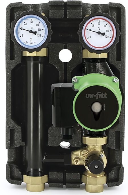 Насосная группа Uni-Fitt (Юни-Фит) НСГ DN25, с термосмесителем, Uni-Fitt GTO 25-6S представляет собой инновационное решение для эффективного контроля и регулирования тепловых процессов в низкотемпературных системах отопления. Этот продукт обеспечивает надежное и безопасное функционирование системы, гарантируя оптимальное распределение тепла в помещениях.