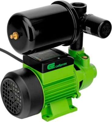 Насосная станция СИБРТЕХ НС400-Ч, состоящая из гидроаккумулятора и вихревого насоса. Данный набор обеспечивает постоянную подачу чистой воды до потребителя. Максимальная глубина залегания воды — 7 метров. Автоматически включается и выключается при достижении заданных показателей давления. Идеально подходит для полива на дачном участке.