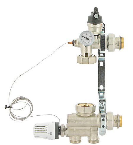 Насосно-смесительный узел Uni-Fitt (Юни-Фит) SOLOMIX 1, без насоса используется в конструкции теплых полов в качестве элемента охлаждения теплоносителя. Данное устройство оснащается термостатической головкой для регулирования температуры, термометром, байпасом с несколькими регулировками и другими приспособлениями.