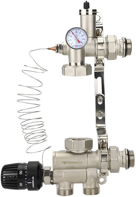 Узел от бренда VARMEGA (ВАРМЕГА) VM15011 1″ обеспечивает объединение насосно-смесительной арматуры для работы низкотемпературной отопительной системы. Комплект оснащен термостатической головкой и выносним датчиком температуры для более точного контроля показателей. Циркуляционный насос приобретается отдельно.