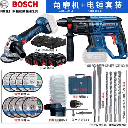 Отбойный молоток Bosch GBH180-Li + Угловая шлифовальная машина Bosch GWS180, четыре аккумулятора 5.0Ah, два зарядных устройства