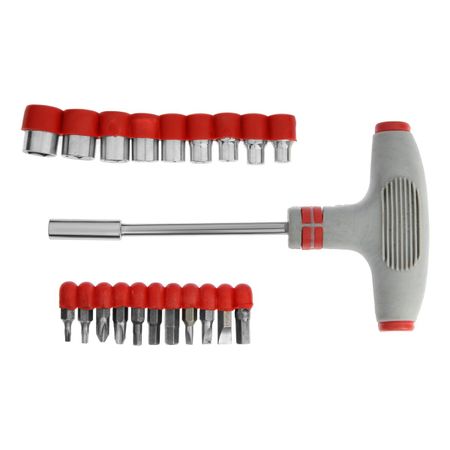 Отвертка с набором бит и головок ТУНДРА, Т-образный профилированный держатель, 21 предмет. Набор отверток TUNDRA basic предназначен для монтажа и демонтажа резьбовых соединений во время проведения ремонтных работ. Инструмент изготовлен из прочного и высококачественного металла, оснащен анатомической обрезиненной рукояткой, которая не дает скользить рукам. Состав <ul> <li> Биты — 11 шт. </li> <li> Торцевые головки — 9 шт. </li> <li> Вороток для бит с магнитным наконечником — 1 шт. </li> <li> Удлинитель для бит и торцевых головок — 1 шт. </li> </ul> <ul> </ul>