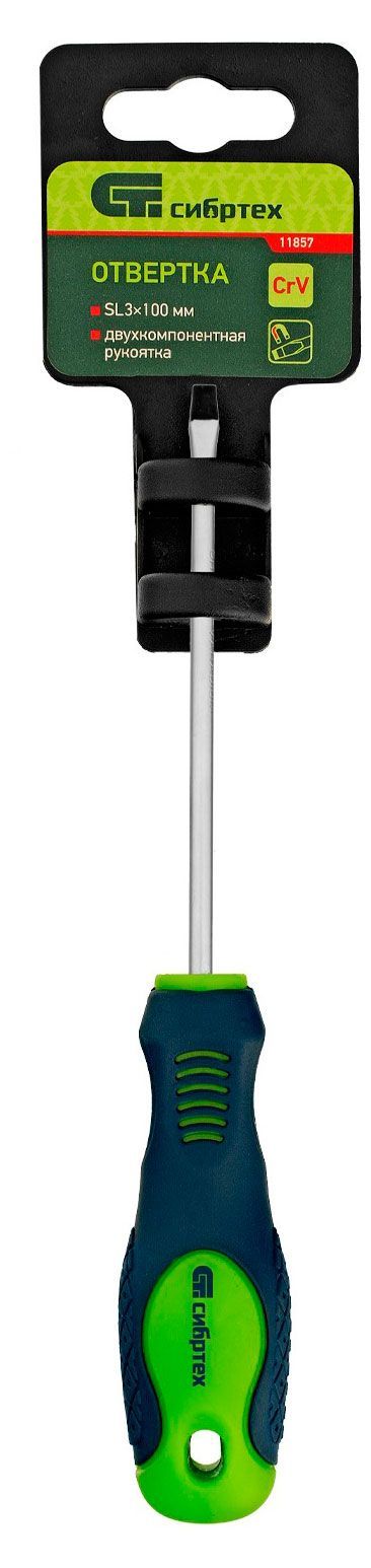 Отвертка Сибртех 11857, SL3,0 х 100 мм, из стали CrV, с 2-х компонентной рукояткой, подходит для работ, не требующих большого усилия затяжки. С ее помощью осуществляется монтаж/демонтаж крепежных элементов типа Slotted. Отвертка оснащена стержнем длиной 100 мм для работ в углублениях и на поверхностях. Инструмент пригодится для полупрофессионального применения.
