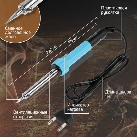 Паяльник ТУНДРА, индикатор работы, долговечное жало, 40 Вт, 220 В. Паяльник ТУНДРА предназначен для работ, связанных с точечным нагревом. Инструмент применяется для следующих видов работ: пайка, лужение, монтаж металлических деталей и работ по дереву. Долговечное жало обеспечит долгим сроком службы и сохранением качественной работы. С помощью светового индикатора, встроенного в инструмент можно с легкостью определить нагрев инструмента. Паяльник питается от сети в 220 В. и имеет мощность в 40 Вт, благодаря чему происходит быстрый нагрев жала. Специальный изоляционный слой предотвращает случайный контакт с токоведущей частью во время работы с инструментом. Удобная пластиковая рукоятка обеспечит удобством во время работы.