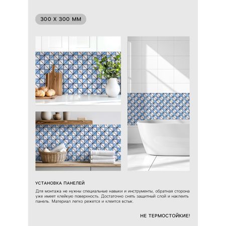 Панель ПВХ самоклеящаяся TAKE IT EASY «Треугольники», мягкая, 300×300 мм, цвет синий. <b> Самоклеющиеся ПВХ — панели: решение для быстрого ремонта</b> Представляют собой простой и удобный материал для быстрой отделки помещений. Используют для обновления интерьера квартир, офисов и коммерческих объектов. Данный облицовочный материал позволяет быстро преобразить пространство, создать уют и освежить отделку стен. <b> Преимущества самоклеющихся панелей</b> <ul> <li> <strong> Простота установки:</strong> монтаж панелей не требует специальных инструментов и опыта, так как одна сторона покрыта клеевым слоем.</li> <li> <strong> Влагостойкость:</strong> панели устойчивы к воздействию влаги, их можно успешно применять в кухнях и ванных комнатах.</li> <li> <strong> Легкий уход:</strong> поверхность панелей легко очищается мягкой губкой с нейтральными моющими средствами.</li> <li> <strong> Экономия времени:</strong> благодаря простоте наклеивания монтаж занимает минимум времени, позволяя быстро завершить ремонтные работы.</li> </ul> Применение Рекомендации по установке и эксплуатации <ol> <li> Не применяйте панели в местах с прямым контактом воды, таких как пол или зона готовки на кухне.</li> <li> Перед укладкой очистите стену от пыли и грязи, обработав спиртосодержащим раствором для удаления жирных пятен.</li> <li> <strong> Используйте дополнительный клей для ПВХ</strong> для усиления фиксации, особенно на сложных поверхностях.</li> <li> Избегайте чрезмерного натяжения при наклейке, иначе возможны деформации.</li> </ol>