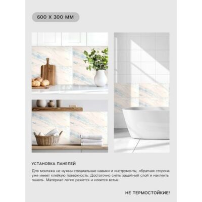 Панель ПВХ самоклеящаяся TAKE IT EASY «Мрамор, 600×300 мм, цвет белый/синий. <b> Самоклеющиеся ПВХ — панели: решение для быстрого ремонта</b> Представляют собой простой и удобный материал для быстрой отделки помещений. Используют для обновления интерьера квартир, офисов и коммерческих объектов. Данный облицовочный материал позволяет быстро преобразить пространство, создать уют и освежить отделку стен. <b> Преимущества самоклеющихся панелей</b> <ul> <li> <strong> Простота установки:</strong> монтаж панелей не требует специальных инструментов и опыта, так как одна сторона покрыта клеевым слоем.</li> <li> <strong> Влагостойкость:</strong> панели устойчивы к воздействию влаги, их можно успешно применять в кухнях и ванных комнатах.</li> <li> <strong> Легкий уход:</strong> поверхность панелей легко очищается мягкой губкой с нейтральными моющими средствами.</li> <li> <strong> Экономия времени:</strong> благодаря простоте наклеивания монтаж занимает минимум времени, позволяя быстро завершить ремонтные работы.</li> </ul> Применение Рекомендации по установке и эксплуатации <ol> <li> Не применяйте панели в местах с прямым контактом воды, таких как пол или зона готовки на кухне.</li> <li> Перед укладкой очистите стену от пыли и грязи, обработав спиртосодержащим раствором для удаления жирных пятен.</li> <li> <strong> Используйте дополнительный клей для ПВХ</strong> для усиления фиксации, особенно на сложных поверхностях.</li> <li> Избегайте чрезмерного натяжения при наклейке, иначе возможны деформации.</li> </ol>