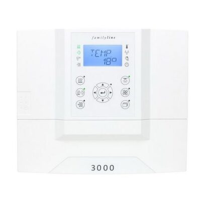В панели управления FASEL (Фасел) familyline 3000 (управление температурой) информация выводится на подсвечиваемый ЖК-дисплей. С помощью пульта можно регулировать яркость света в парной, мощность вентиляции, а также менять длительность обогрева.