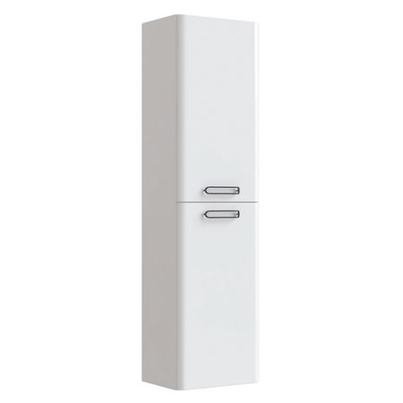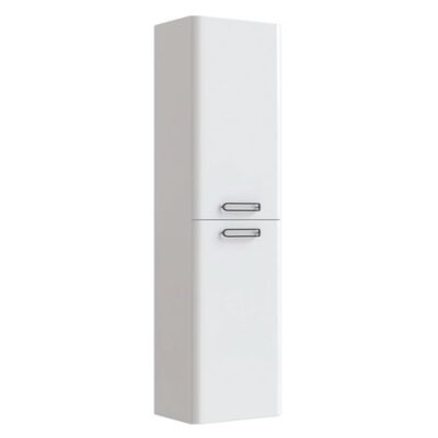 Пенал для ванной комнаты, подвесной. Размеры: 300х400х1500 мм (ДхШхВ). Универсальная ориентация. Фасады МДФ 19 мм в эмали (цвет белый глянец). Корпус влагостойкий ЛДСП 16 мм в эмали. Две дверцы. Ручки — цвет состаренное олово. Стеклянные полки 4 мм с фиксаторами. Петли с доводчиками.