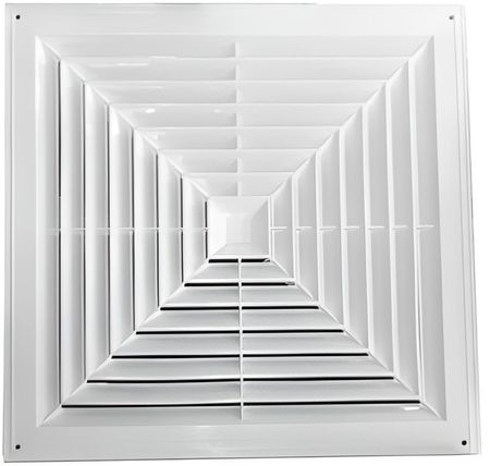 Потолочные решетки диффузорного типа 600х600 от отечественного производителя изготовлены из качественного пластика белого цвета. Они выполнены в виде диффузора веерного типа, благодаря чему воздух из вентиляционной системы распределяется в четырех направлениях. Решетки имеют квадратную форму.