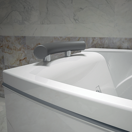 Подголовник на ножках обладает улучшенной конструкцией и обеспечивает максимальное удобство во время принятия ванны. Он позволяет комфортно расположить голову и снимает напряжение с шейного отдела. Красивый серебристый цвет хорошо сочетается с белоснежной ванной и в то же время является неким акцентом, придающим ванне особую привлекательность.