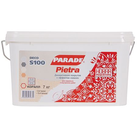 Главная » Строительство и ремонт покрытие декоративное PARADE S100 Pietra 7кг кварц, арт.S100коралл Просмотров 8 /Pietra S100/7кг коралл,акрилов с эф.камня,атмосферостойкость расход 7кг- 8-12м2,стойкость к эксплуатационным нагрузкам PARADE