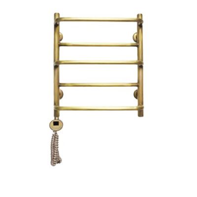 Электрический полотенцесушитель из латуни марки Л59. Цвет «Античная бронза». Труба цельнотянутая. Вертикальные стойки имеют диаметр 28 мм., горизонтальные перекладины выполнены из трубы диаметром 18мм. ТЭН имеет цифровой терморегулятор, температура регулируется от 35 до 70 градусов. Встроен таймер автоотключения на 2 и 4 часа. ТЭН оснащён термодатчиком, который защищает устройство от перегрева. Поставляется в сборном виде. Возможно скрытое подключение.