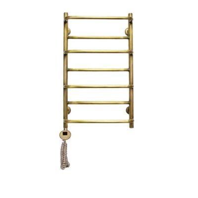 Электрический полотенцесушитель из латуни марки Л59. Цвет «Античная бронза». Труба цельнотянутая. Вертикальные стойки имеют диаметр 28 мм., горизонтальные перекладины выполнены из трубы диаметром 18мм. ТЭН имеет цифровой терморегулятор, температура регулируется от 35 до 70 градусов. Встроен таймер автоотключения на 2 и 4 часа. ТЭН оснащён термодатчиком, который защищает устройство от перегрева. Поставляется в сборном виде. Возможно скрытое подключение.