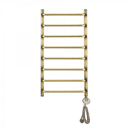 Электрический полотенцесушитель из латуни марки Л59. Цвет «Античная бронза». Труба цельнотянутая. Вертикальные стойки имеют диаметр 28 мм., горизонтальные перекладины выполнены из трубы диаметром 18мм. ТЭН имеет цифровой терморегулятор, температура регулируется от 35 до 70 градусов. Встроен таймер автоотключения на 2 и 4 часа. ТЭН оснащён термодатчиком, который защищает устройство от перегрева. Поставляется в сборном виде. Возможно скрытое подключение.