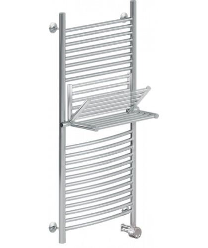 Данная модель представляет собой конструкцию из двух стояков, выполненных из нержавеющей стали европейского производства, а также перемычек, расположенных вдоль всей длины стояков. Благодаря высокой теплоотдаче, полотенцесушитель демонстрирует отличное качество работы. Модель полотенцесушителя, оснащенная складной полочкой.