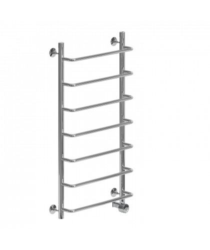 Представленная модель выполнена в виде лесенки с двумя вертикальными стойками и горизонтальными перемычками трапециевидной формы, расположенными между ними. Благодаря своей простой конструкции и стильному виду данный полотенцесушитель станет настоящим украшением Вашей ванной.