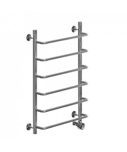 Представленная модель выполнена в виде лесенки с двумя вертикальными стойками и горизонтальными перемычками трапециевидной формы, расположенными между ними. Благодаря своей простой конструкции и стильному виду данный полотенцесушитель станет настоящим украшением Вашей ванной.