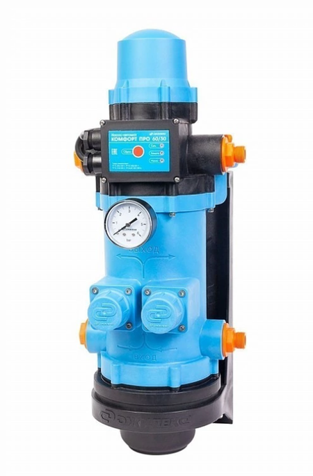 Оснащен контролем потока, управляющим насосом и защищающим его от работы на сухом ходу