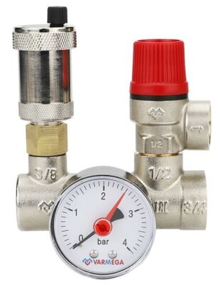 VARMEGA (Вармега) VM16201 1″ это группа безопасности с присоединительным размером 1 . Модель разработана для использования в составе закрытых систем водяного отопления, которые благодаря ей надежно предохраняются от избыточного давления. В состав группы входят автоматический воздухоотводчик, запорный клапан и манометр.