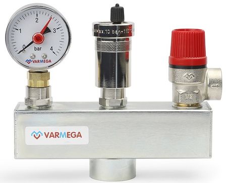 Группа безопасности VARMEGA (Вармега) VM16301 1″ создана для закрытых систем водяного отопления с целью автоматического отвода воздуха и контроля давления в контуре. Модель включает в себя воздухоотводчик, манометр и предохранительный клапан. Все три элемента конструкции объединены на общей консоли из оцинкованной стали.