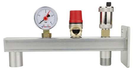 VARMEGA (Вармега) VM16401 3/4″ это эргономичная и функциональная группа безопасности для отопительной системы. На общую консоль в ней собраны автоматический воздухоотводчик, манометр и предохранительный клапан. Поскольку манометр и отводчик распределены через отсечные клапаны, демонтаж группы можно производить без слива воды из системы.