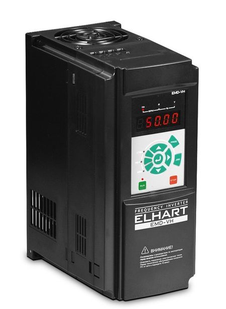 Для управления трёхфазного электродвигателя с короткозамкнутым ротором используются преобразователи частоты серии EMD-VH бренда ELHART, которые имеют векторный режим управления с поддержкой энкодеров. Модели мощностью от 75 до 450 квт управляются с не съёмного пульта, но возможно подключение и внешнего EMD-V-RCP, который заказывается отдельно.
