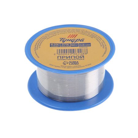 Припой ТУНДРА, ПОС 63, на катушке, 0.6 мм, 50 г. Припой ТУНДРА применяется для лужения и пайки электропроводки, электронных схем и других электрических изделий. Припой ПОС 63 используется для закрепления методом пайки нескольких металлических элементов из разных типов металла. Увеличенное содержание олова в припое обеспечивает более комфортную работу.
