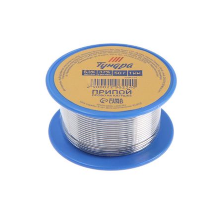 Припой ТУНДРА, ПОС 63, на катушке, 1 мм, 50 г. Припой ТУНДРА применяется для лужения и пайки электропроводки, электронных схем и других электрических изделий. Припой ПОС 63 используется для закрепления методом пайки нескольких металлических элементов из разных типов металла. Увеличенное содержание олова в припое обеспечивает более комфортную работу.