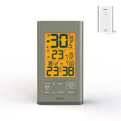 Профессиональный беспроводной цифровой термометр RST с датчиком имеет подсветку дисплея. Используется для измерения температуры в помещении и на улице. определения тенденции и динамики изменения температуры, определения суточных максимального и минимального зарегистрированных значений температур. В прибор встроены часы с rcc сигналом, календарь и будильник, сигнализатор возникновения гололеда, индикатор состояния батареи станции и радиодатчика.