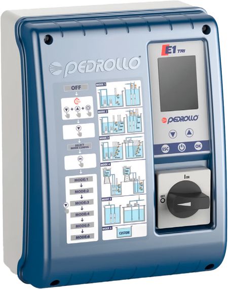 Пульт Pedrollo (Педролло) E1 — TRI/2 V400/50-60Hz предусматривает режимы автоматического управления трехфазным насосом. Изделие может применяться как в стандартных системах водопровода, так и в магистралях очистки и отходов. Возможность выбора между 6 предустановленных программ значительно упрощает эксплуатацию.