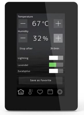 Сенсорные пульты управления бренда Tylo оснащены богатым функционалом и выполнены в лаконичном стильном дизайне. Пульт подключается по Wi-Fi, что обеспечивает мобильность управления. Установленное на смартфон приложение позволяет с легкостью управлять всеми настройками сауны, включая вентиляцию и ароматизацию помещения.