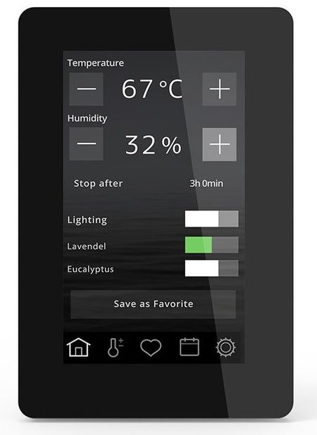 Сенсорный пульт управление Tylo (Туло) Elite Cloud обладает большим функционалом, позволяющим пользователям управлять не только температурой и влажностью в банях и саунах, но и освещенностью, вентиляцией и ароматизацией помещения. Экран показывает все параметры сауны, а устройство позволяет запрограммировать настройки.