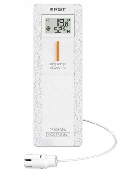 Rst (Рст) 2774 радиодатчик температуры и влажности с выносным сенсором для метеостанций и электронным термометрам имеет три канала передачи на частоте 433 МГц и может использоваться как автономный термогигрометр с внешним датчиком. Датчик оснащен ЖК-дисплеем, который на корпусе датчика отображает текущую температуру в месте расположения датчика, состояние батареи, точное время передачи и информацию о номере используемого радиоканала.