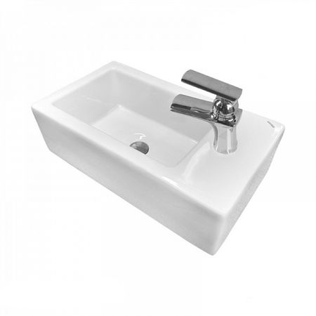 Раковина Акватон Эрис 46 1WH301972. С одним боковым отверстием под смеситель. С переливом. Задняя сторона раковины не глазурована, разместить смеситель можно только справа. Компактный мебельный рукомойник для установки на мебельный элемент или столешницу.