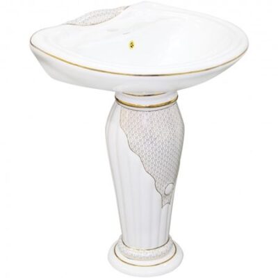Раковина выполнена в стиле модерн, форма пьедестала – ваза, цвет белый с золотым декором.