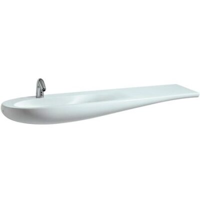 Раковина-столешница Laufen Alessi One шириной 160 см. Артикул: 8.1497.1.400.104.1. Подходит для ванных комнат различной планировки в современном стиле и отличается плавными линиями и изящной оригинальной формой. Цвет: белый. Материал: качественная керамика с грязеотталкивающим покрытием LLC (Laufen Clean Coat) — загрязнения, накипь и бактерии легко смываются водой, обеспечивая самые высокие стандарты чистоты и гигиены. Размер (ШхДхВ): 160 х 50 х 16 см. 1 готовое отверстие для смесителя. Чаша слева, крыло справа. Монтаж: накладной (на тумбу), подвесной. В комплекте поставки: раковина.