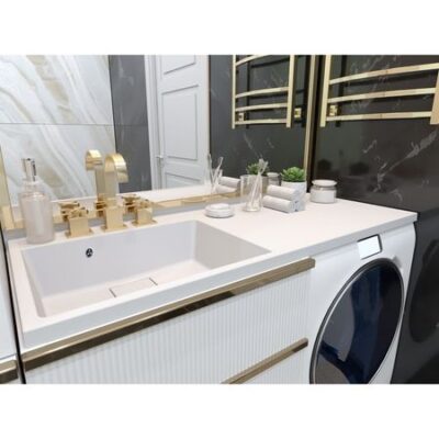 Раковина изготовлена из высококачественного и экологически чистого сырья, натуральной мраморной крошки и полимерных связующих смол. Поверхность раковины имеет декоративное покрытие на основе гелькоута с глянцевым блеском. Обладает высокой стойкостью к загрязнениям и желтизне, не имеет микропор. Умывальник не требует особого ухода, для очистки поверхности достаточно использовать жидкие неабразивные моющие средства.Подвесная каменная раковина устанавливается в тумбу и над стиральной машинкой на специальный правый кронштейн (1 шт. крепление в комплекте). На 2 кронштейна раковину повесить нельзя, с левой стороны для этого нет необходимого крепления. Тумба может быть подвесная или отдельностоящая. Рекомендованная глубина техники под данную раковину — 45 см.Глубина чаши: 14,6 см. Стандартное отверстие под смеситель 3,5 см.Смеситель и сифон в комплект не входят.