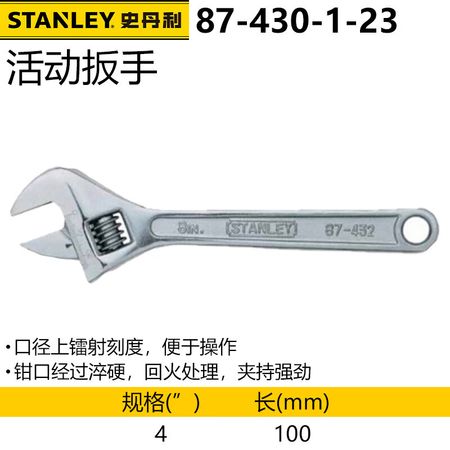Разводной ключ Stanley, 4 дюйма из высокоуглеродистой стали, разводной ключ с открытым зевом, 100 мм 87-430-1-23