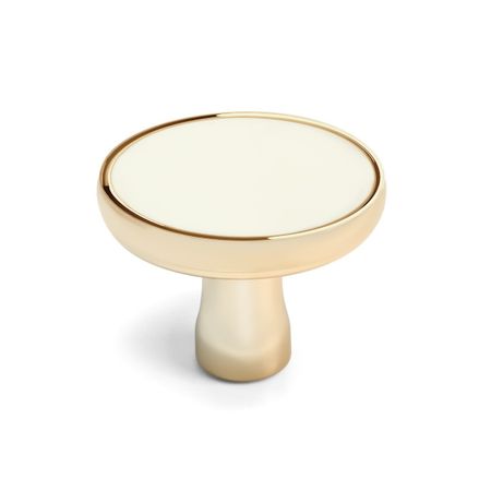 Ручка-кнопка CAPPIO РК103, d=33 мм, пластик, цвет золото. Ручка-кнопка CAPPIO изготовлена в дизайнерском стиле из высокопрочного пластика. Интересный дизайн ручки сочетается с различными типами мебельного гарнитура. Фурнитура имеет привлекательный внешний вид и компактный размер. Золотой оттенок с белой вставкой идеально подходит к мебельным фасадам в различной цветовой гамме. Материал изделия обеспечивает длительный срок службы фурнитуры, эргономичная форма ручки способствует комфортному открыванию мебельных фасадов и ящиков. Мебельная ручка фиксируется к поверхности с помощью винта.