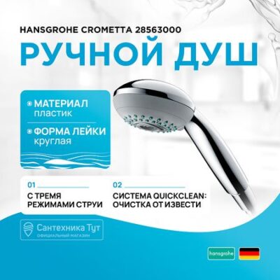 Ручной душ на 3 вида струи. Переключение типов струи с помощью вращающегося душевого диска.