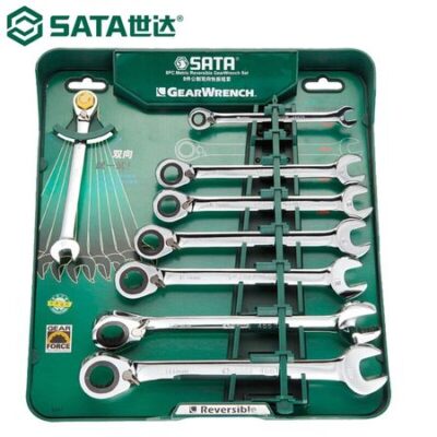 SATA 09041 Набор ключей с храповым механизмом с фиксированной головкой, сливовой открытый ключ, набор инструментов, сливовой открытый ключ двойного назначения, быстродействующий ключ, хром-ванадиевая сталь, набор из 8 предметов, 8-18 мм