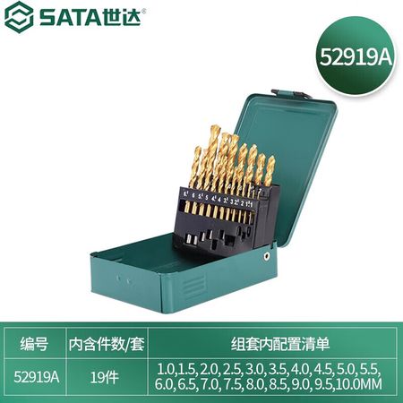 SATA 52919A Набор спиральных сверл из быстрорежущей стали, 19 предметов, полностью шлифованные, с титановым покрытием